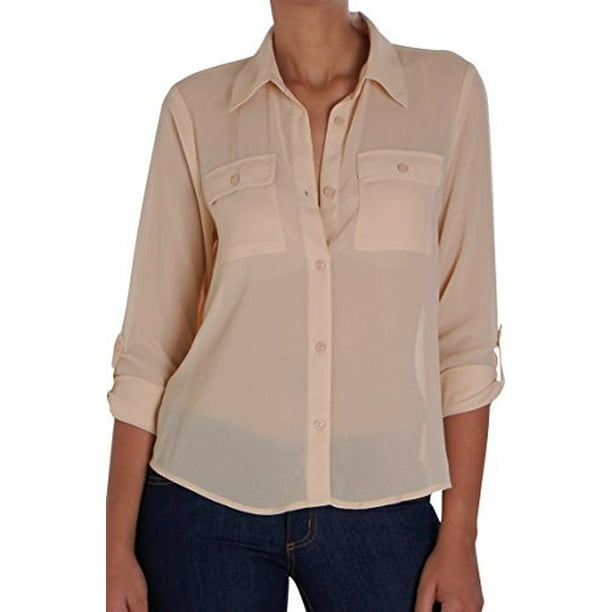 Humble Chic Women S Button Down Pocket Blouse Tan Sm Long Sleeve Chiffon Shirt Nude Walmart Com